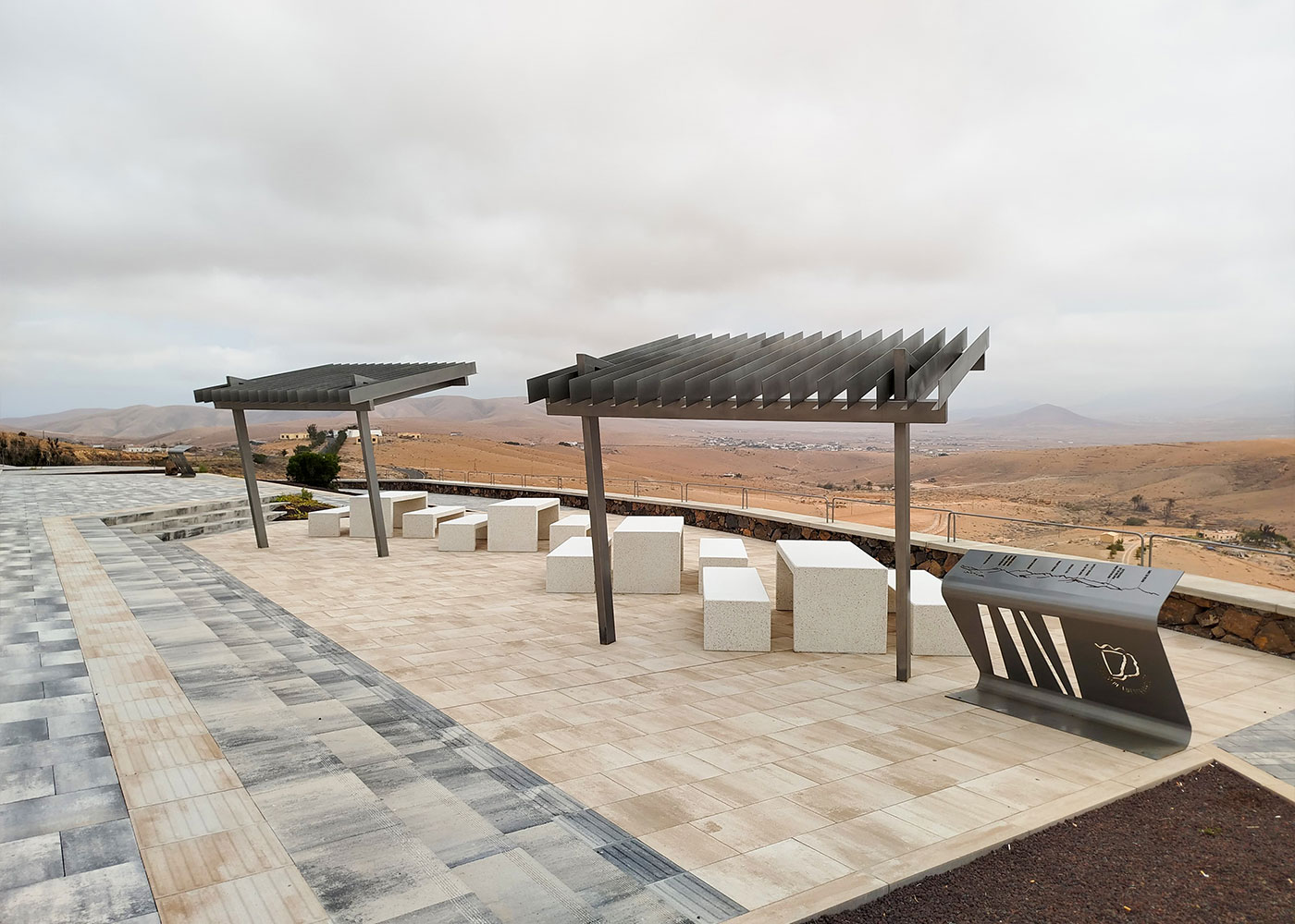 Instalación de mesas Kube de hormigón blanco en el mirador del Valle de Santa Inés, en la isla de Fuerteventura, creando un espacio de descanso integrado en el paisaje.