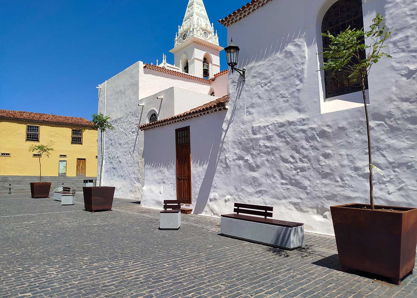 Renovación de la plaza de la iglesia de Los Silos con bancos y sillas Kube Plus, jardineras NER y pilonas Trajana, integrando diseño resistente en un entorno histórico.