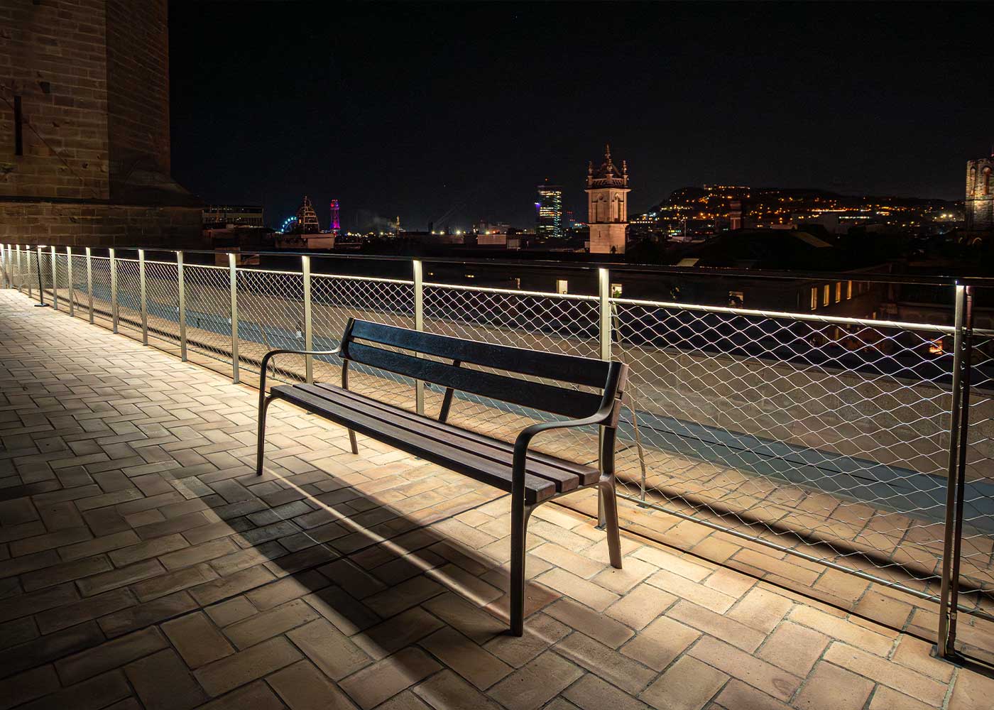 Solución de bancos Citizen ECO y papeleras GEA en la terraza de la Catedral de Barcelona, fabricados en ReBnew, plástico 100 % reciclado, para mejorar el confort y la sostenibilidad.