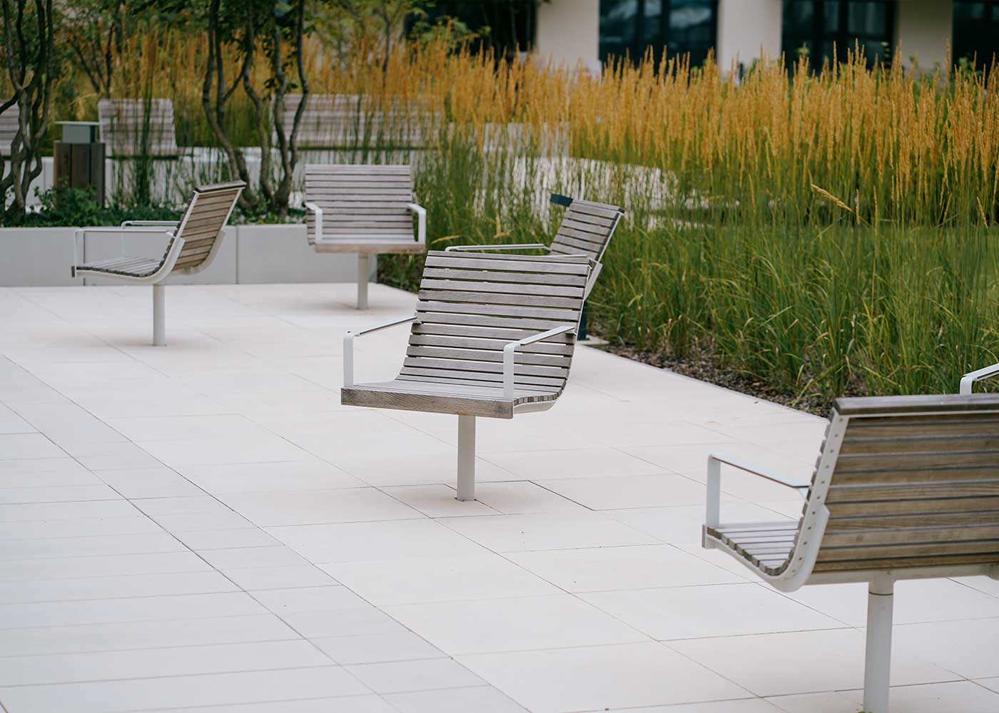 En una nueva zona residencial de Varsovia, las sillas giratorias PIRO y las papeleras OKTO crean un espacio urbano acogedor, funcional y pensado para el bienestar cotidiano.