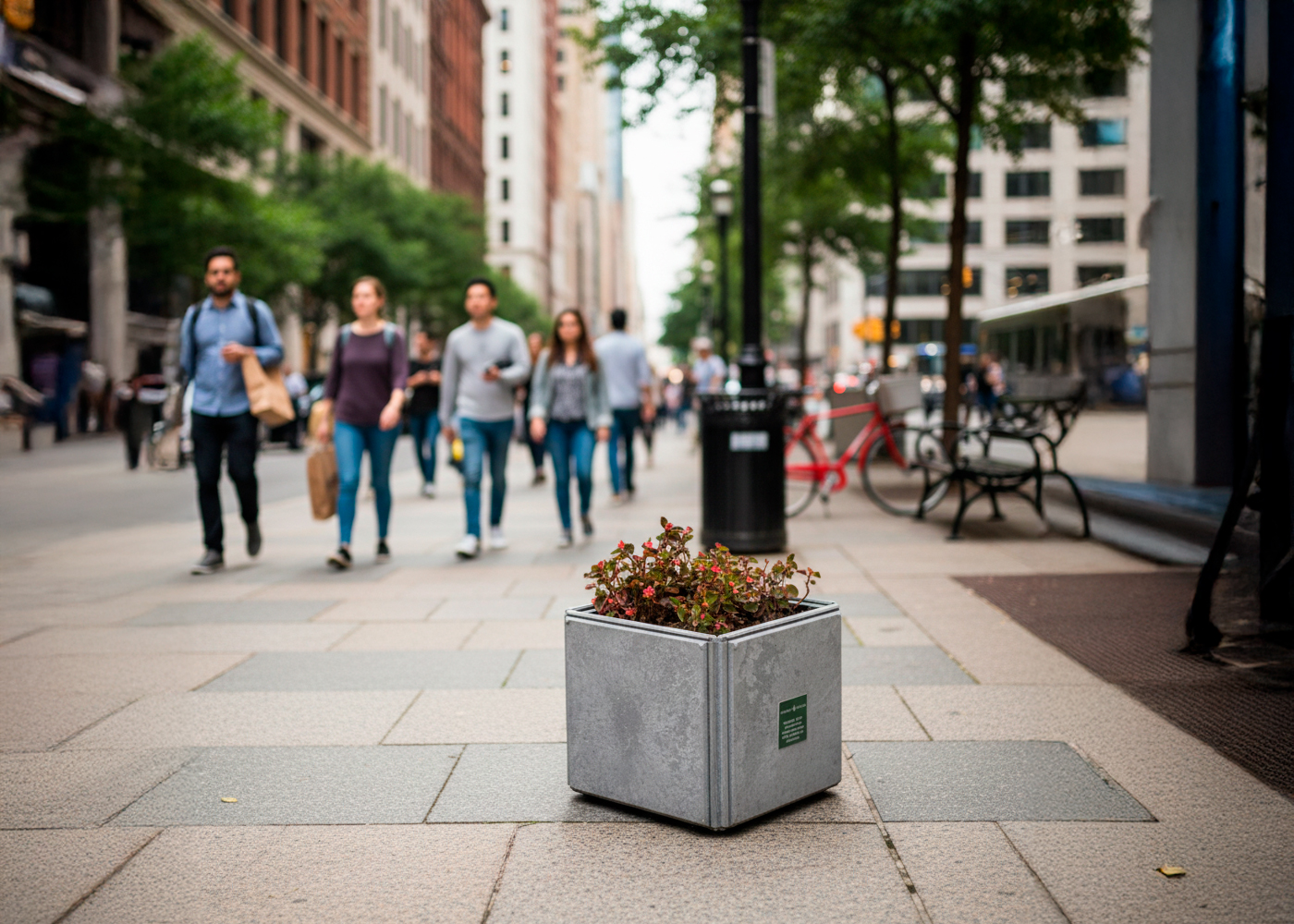 Jardinera de diseño ECO, medidas totales (ancho x profundo x alto) 430x430x445 mm, fabricada en plástico reciclado obtenido de la recogida selectiva urbana, 100% reciclado y reciclable, material durable, inalterable a la intemperie, resistente al agua y que NO requiere ningún tipo de mantenimiento. Apoyada sobre superficie preparada, por su propio peso.