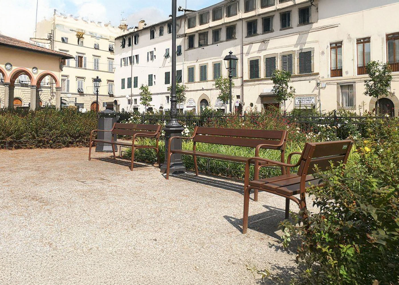 Bancos y sillas Citizen de madera y fundición dúctil instalados en una plaza del centro histórico de Florencia.