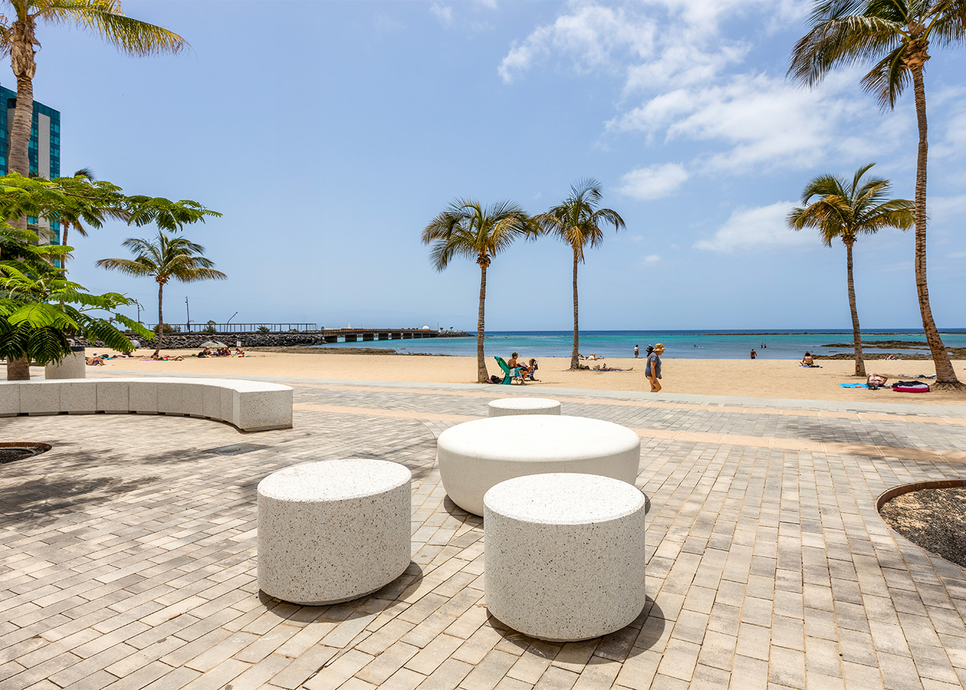 Banco fabricado en prefabricado de hormigón color gris granítico de aspecto rugoso. Se puede colocar en forma de elementos aislados o en grupos. Anclaje recomendado: Apoyado por su propio peso.
