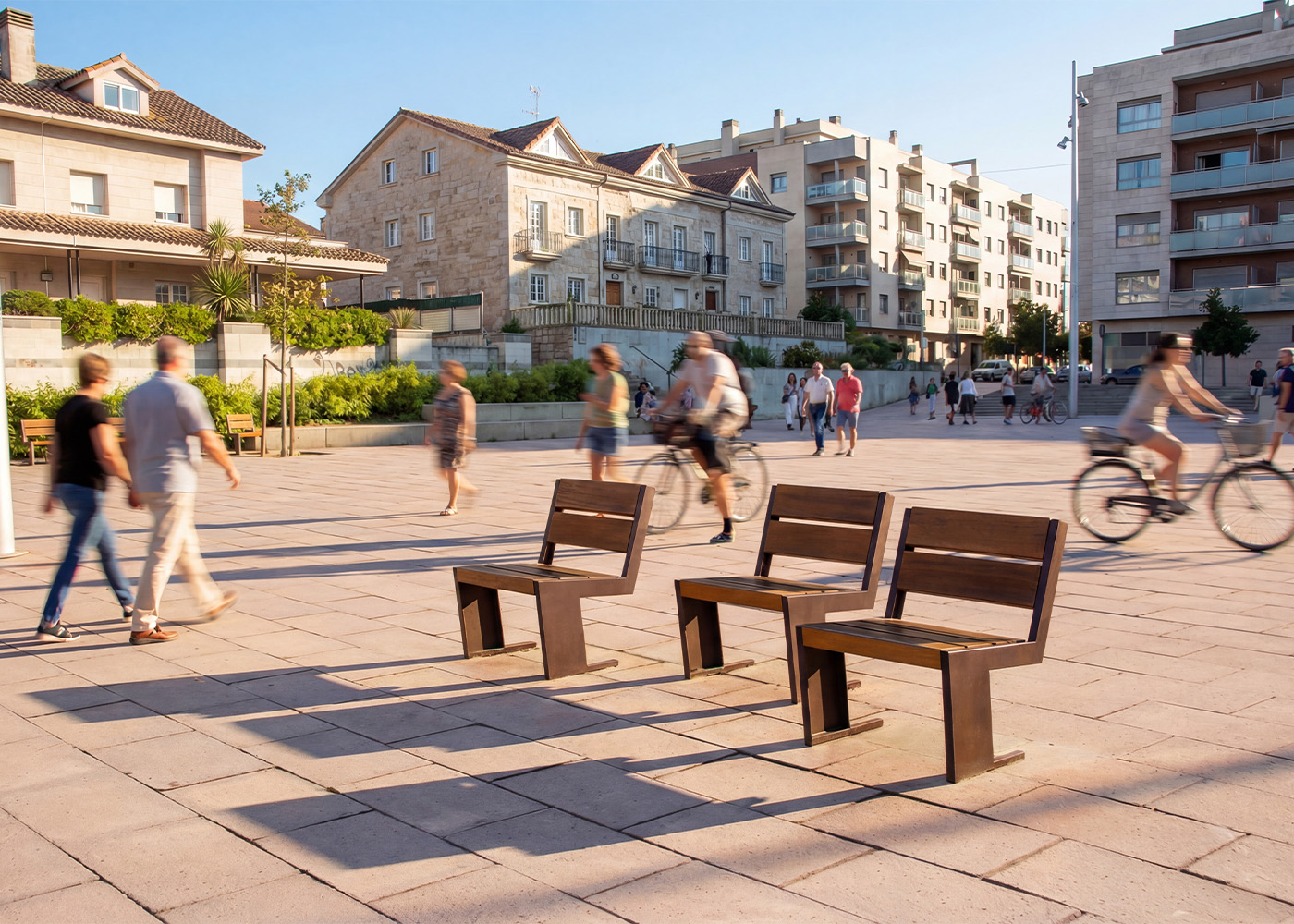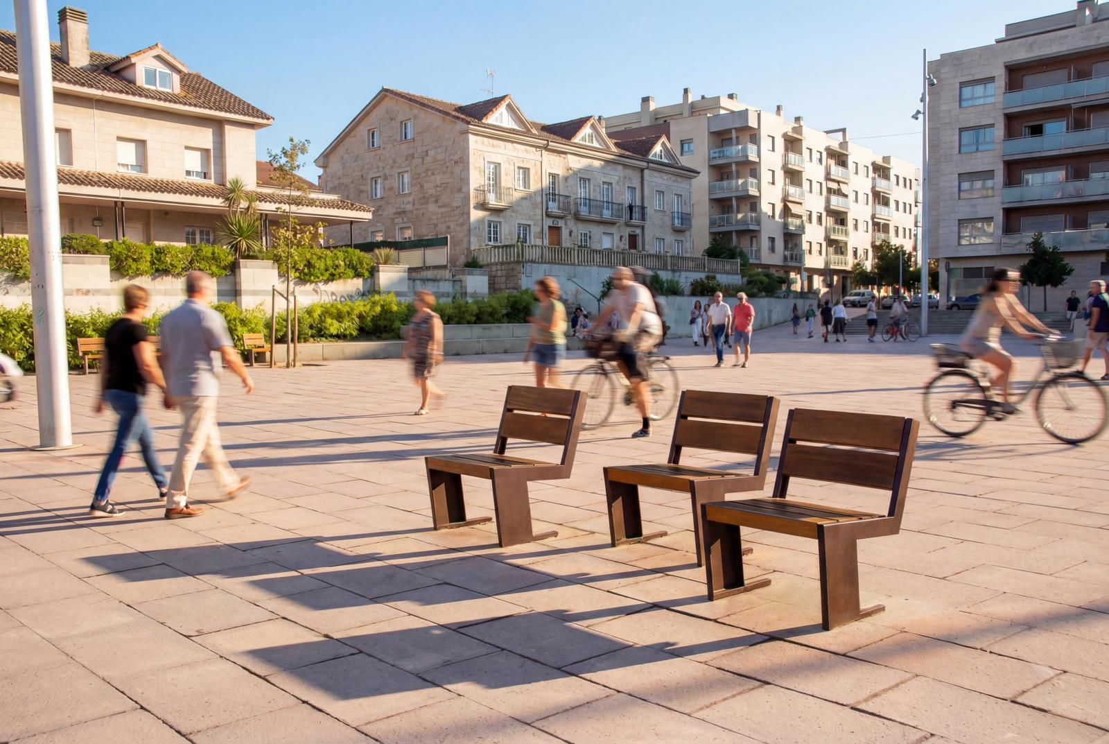 Silla de diseño QUATRO S, medidas totales (largo x alto x profundo) 620x795x665 mm, fabricada con pies de acero galvanizado (tratados con el proceso Ferrus el protector de triple capa para el hierro, que garantiza una óptima resistencia a la corrosión), con imprimación epoxi y acabado en oxirón rojo óxido. Cinco tablones de madera tropical natural (tratados con recubrimiento de triple capa Lignus, protector fungicida, insecticida e hidrófugo). Tornillería de acero inoxidable. Preparado para anclaje con pernos de expansión M10 según superficie y proyecto.