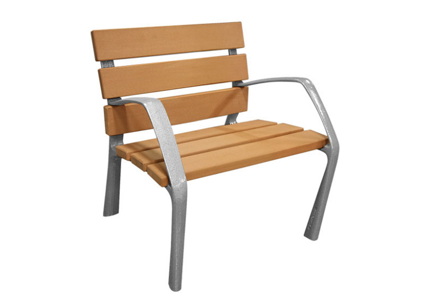 Silla de diseño NEOBARCINO, medidas totales (largo x alto x profundo) 700x825x710 mm, fabricado con pies de fundición dúctil (tratados con el proceso Ferrus el protector de triple capa para el hierro), seis tablones de madera técnica (madera reciclada (60%) y polímeros reciclados (35%) y pigmentos anti UV (5%)). Sin mantenimiento (no se agrieta, ni se astilla, ni se pudre, ni se reseca, resistente a la humedad e inclemencias, anti insectos, carcoma, termitas). Tornillería de acero inoxidable. Preparado para anclaje con pernos de expansión M10 según superficie y proyecto.