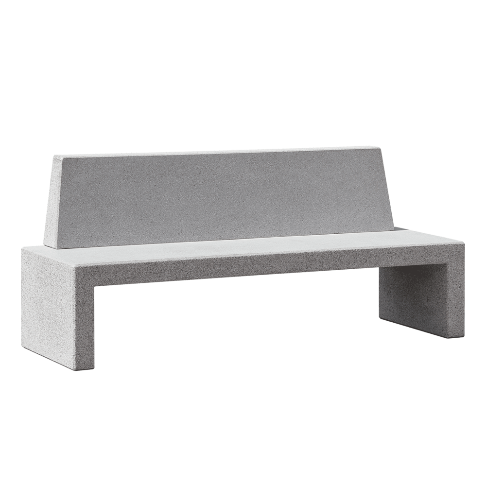 Banco de diseño VOLGA R con respaldo, medidas totales (largo x alto x profundo) 2000x850x600 mm, fabricado en hormigón prefabricado armado color gris granito de aspecto rugoso, pulido en su cara superior. Fijación al suelo por su propio peso, en sus extremos robustos con el objetivo de facilitar la limpieza y el mantenimiento.