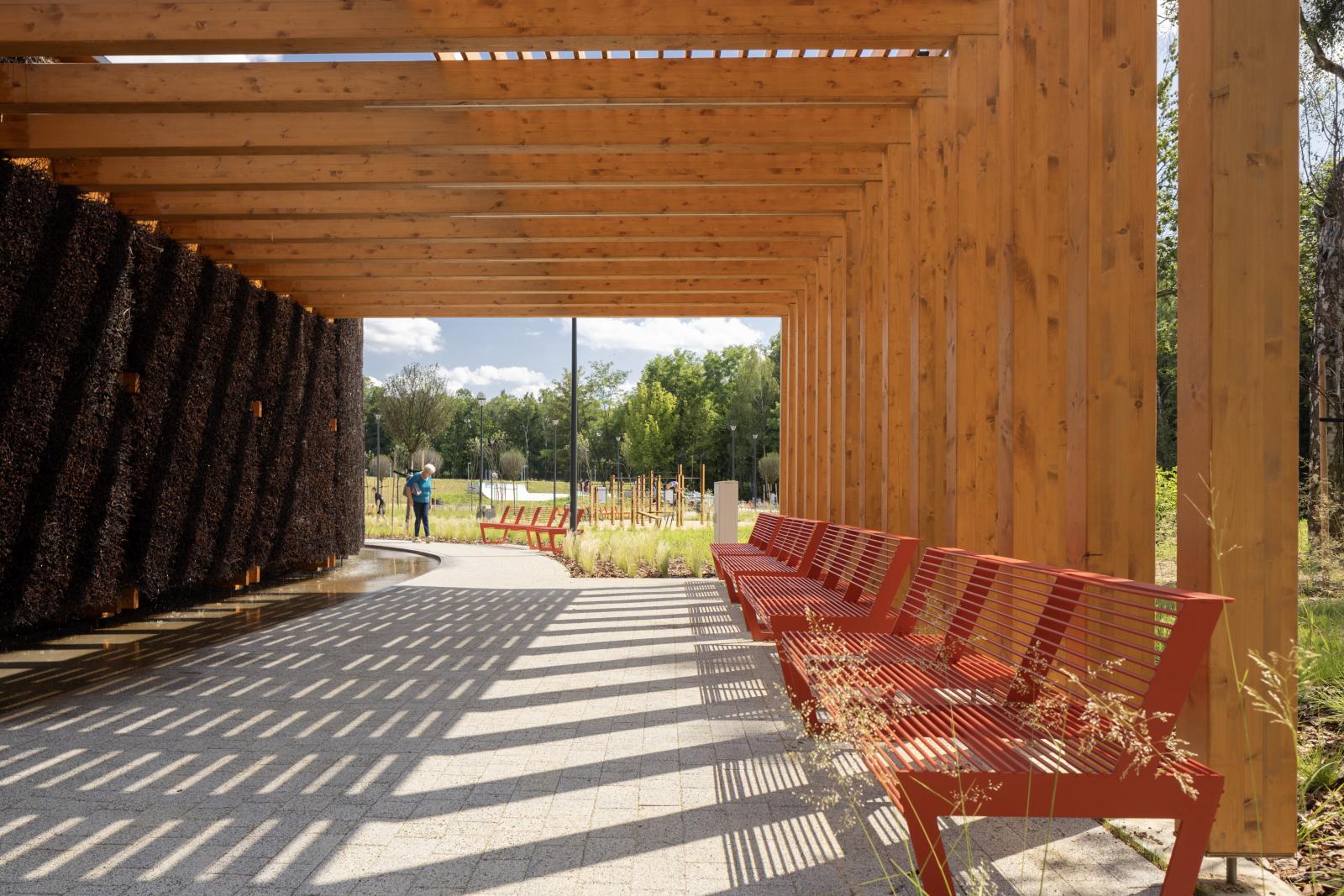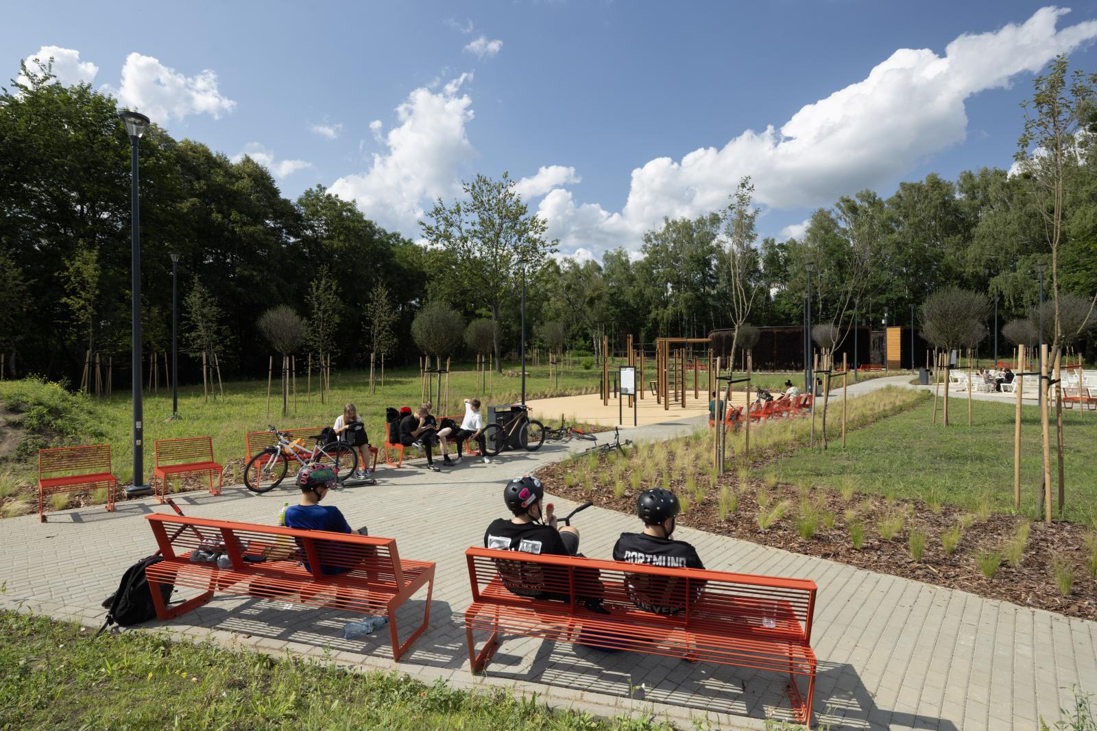 Nuevo proyecto de zona verde equipado con elementos de mobiliario urbano BENITO Design+. Sillas ARNE, mesas POLKA y bancos ARTE crean un entorno moderno, funcional y acogedor.