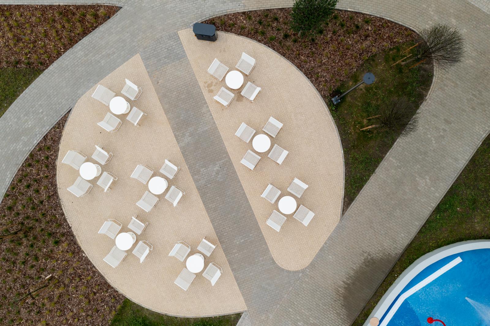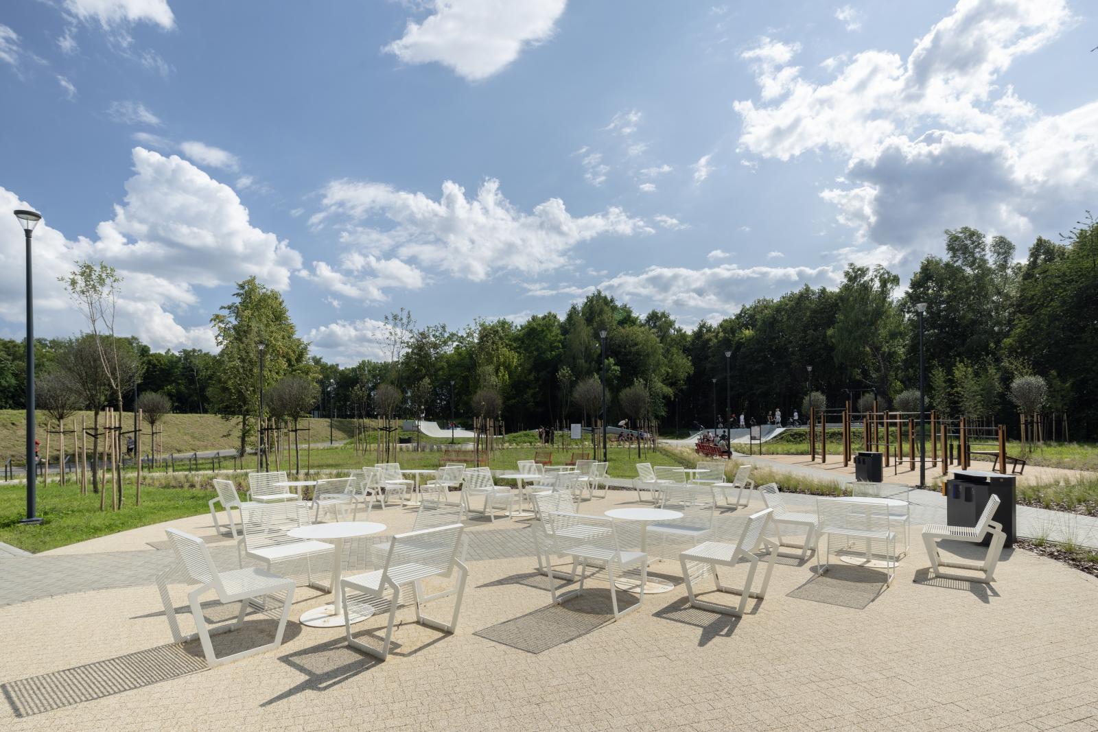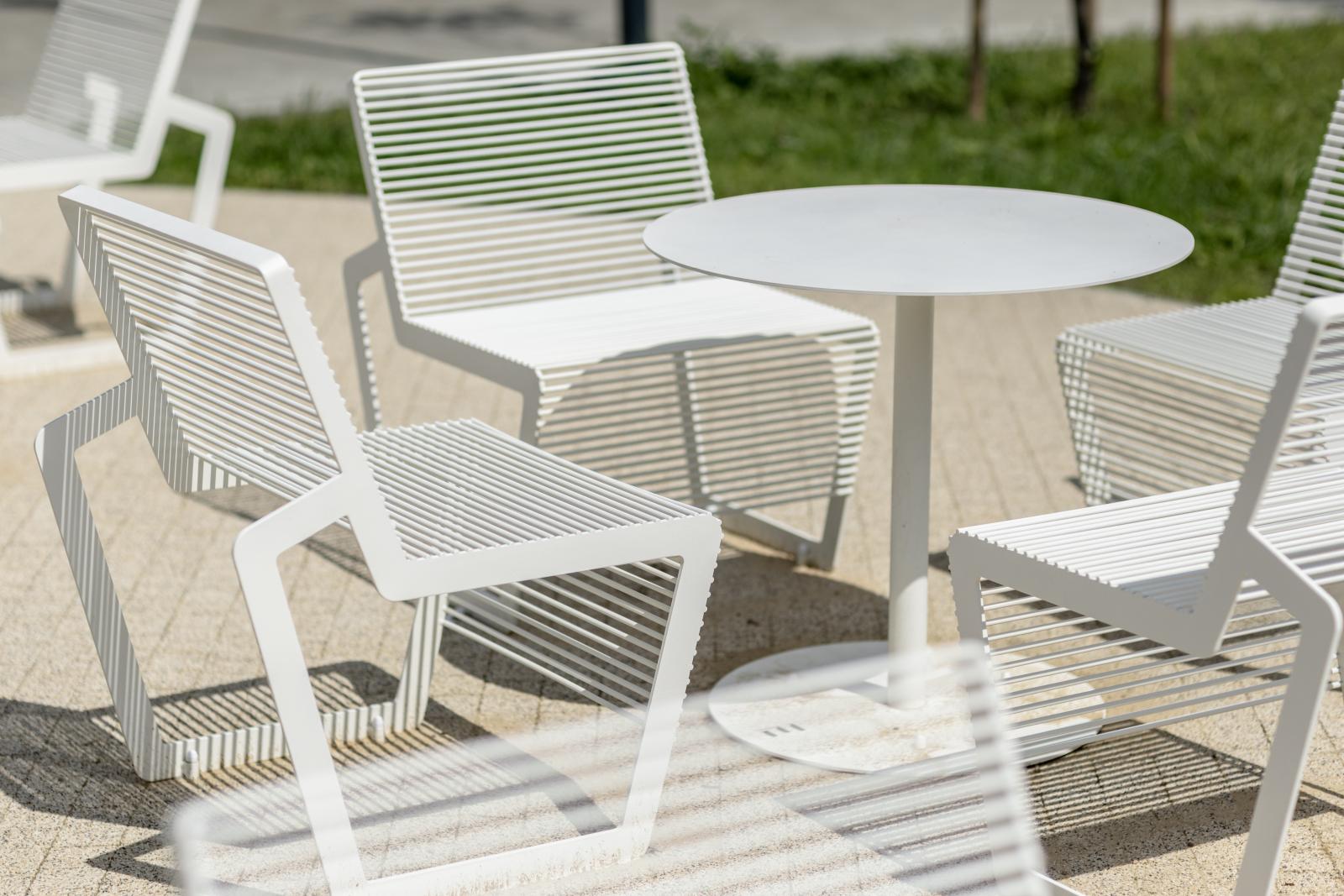 Nuevo proyecto de zona verde equipado con elementos de mobiliario urbano BENITO Design+. Sillas ARNE, mesas POLKA y bancos ARTE crean un entorno moderno, funcional y acogedor.