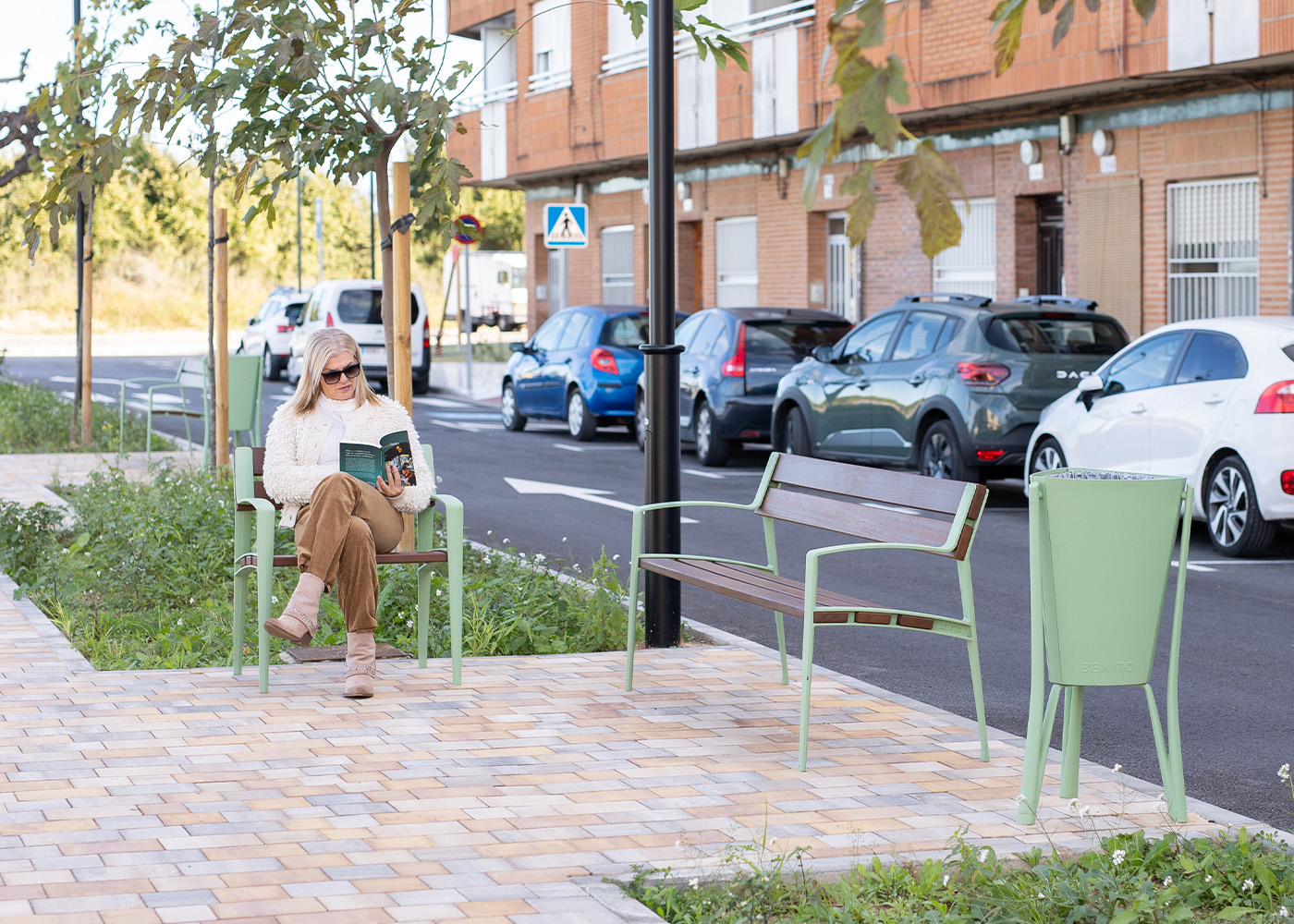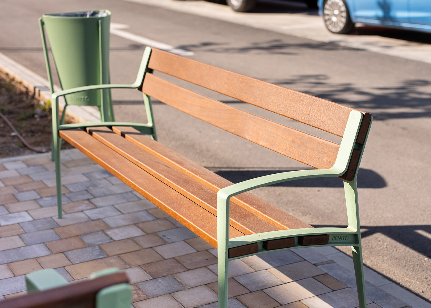 Banco de diseño MINSK-V, medidas totales (largo x alto x profundo) 1800x820x590 mm, fabricado con pies de fundición dúctil (tratados con el proceso Ferrus el protector de triple capa para el hierro, que garantiza una óptima resistencia a la corrosión), con recubrimiento de pintura poliéster en polvo color oliva y cinco tablones de madera tropical natural (tratados con recubrimiento de triple capa Lignus, protector fungicida, insecticida e hidrófugo). Tornillería de acero inoxidable. Preparado para anclaje con pernos de expansión M10 según superficie y proyecto.