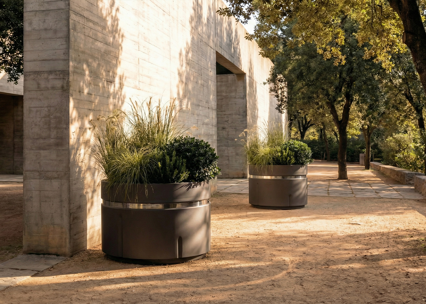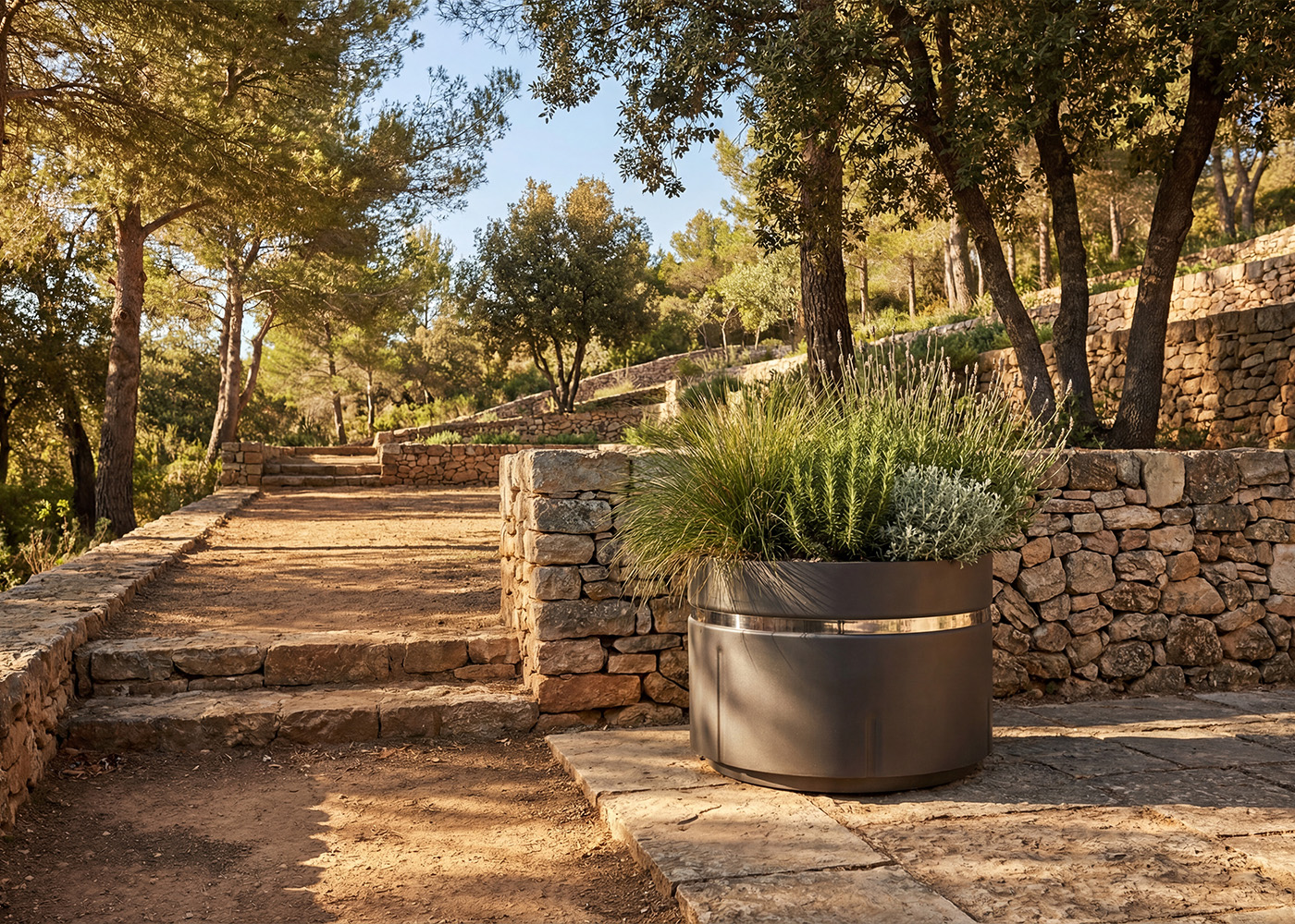 Jardinera de diseño ARO INOX, medidas totales (Ø x alto) 810x560 mm, fabricada en hierro (tratado con el proceso Ferrus el protector de triple capa para el hierro, que garantiza una óptima resistencia a la corrosión). Anillo embellecedor de acero inoxidable. Apoyada sobre superficie preparada, por su propio peso.