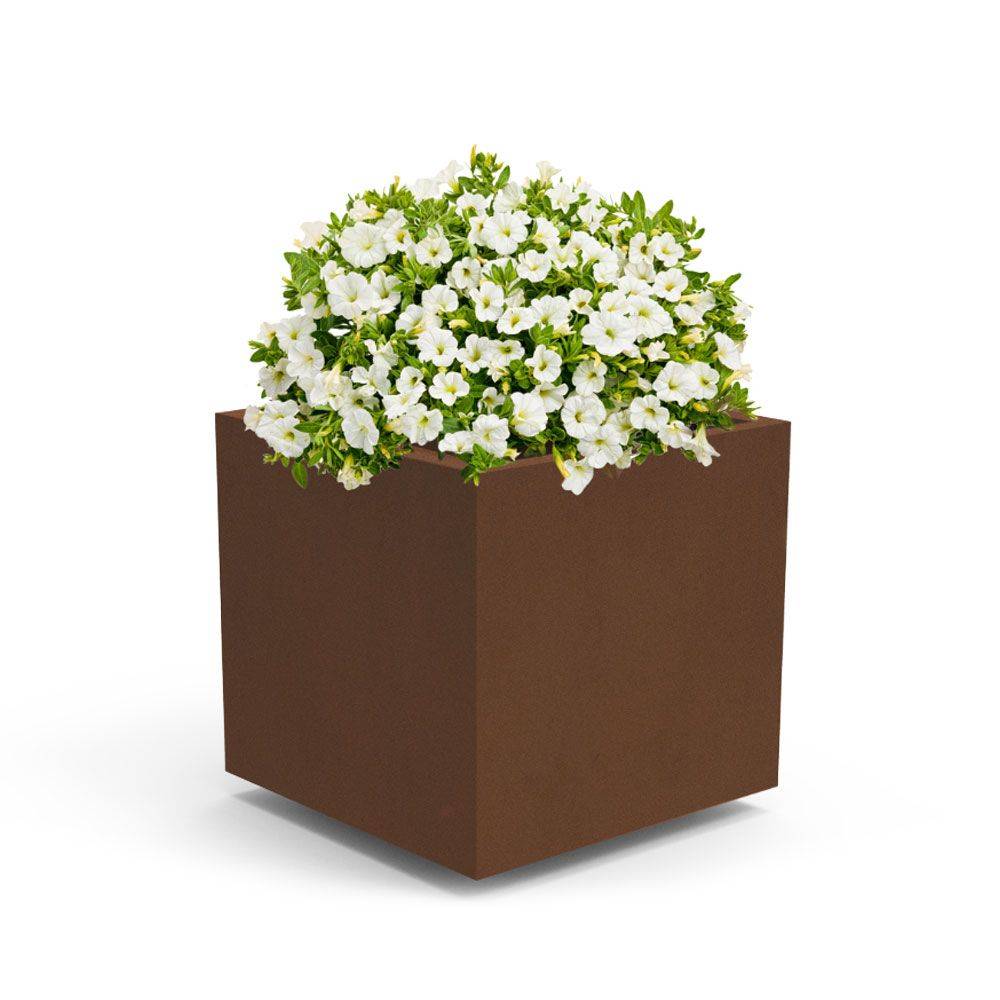 Jardinera de diseño OLEA cuadrada, medidas totales (ancho x profundo x alto) 750x750x750 mm, fabricada en chapa de acero corten (sin mantenimiento). Apoyada sobre superficie preparada, por su propio peso.
