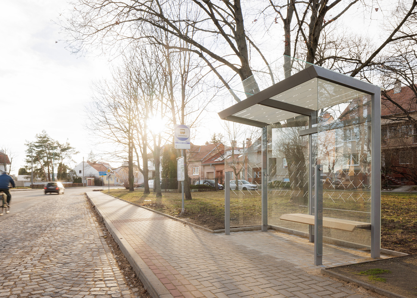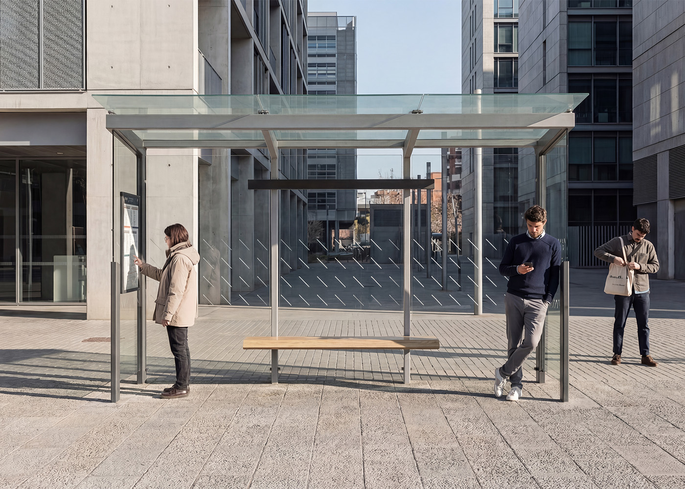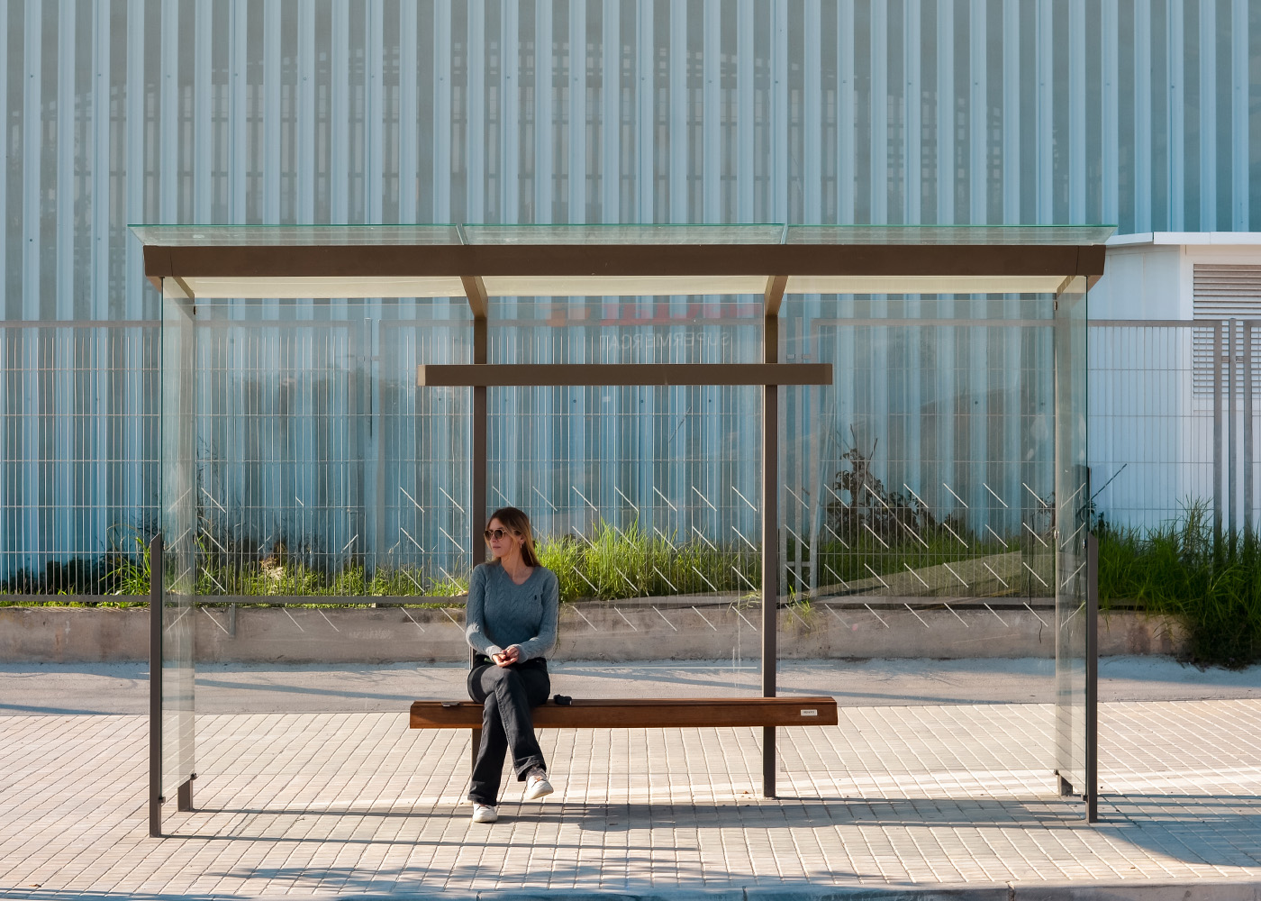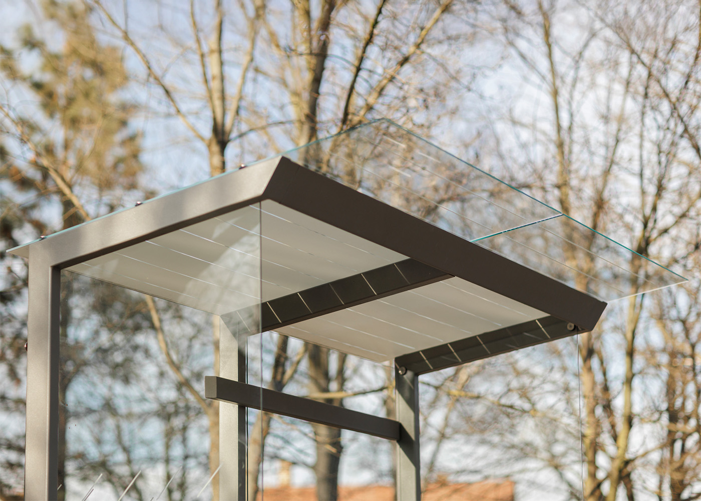 Marquesina de diseño, con estructura fabricada en acero (tratado con el proceso Ferrus el protector de triple capa para el hierro, que garantiza una óptima resistencia a la corrosión). Banqueta en madera tropical tratada con aceite protector. Cristal laminado.