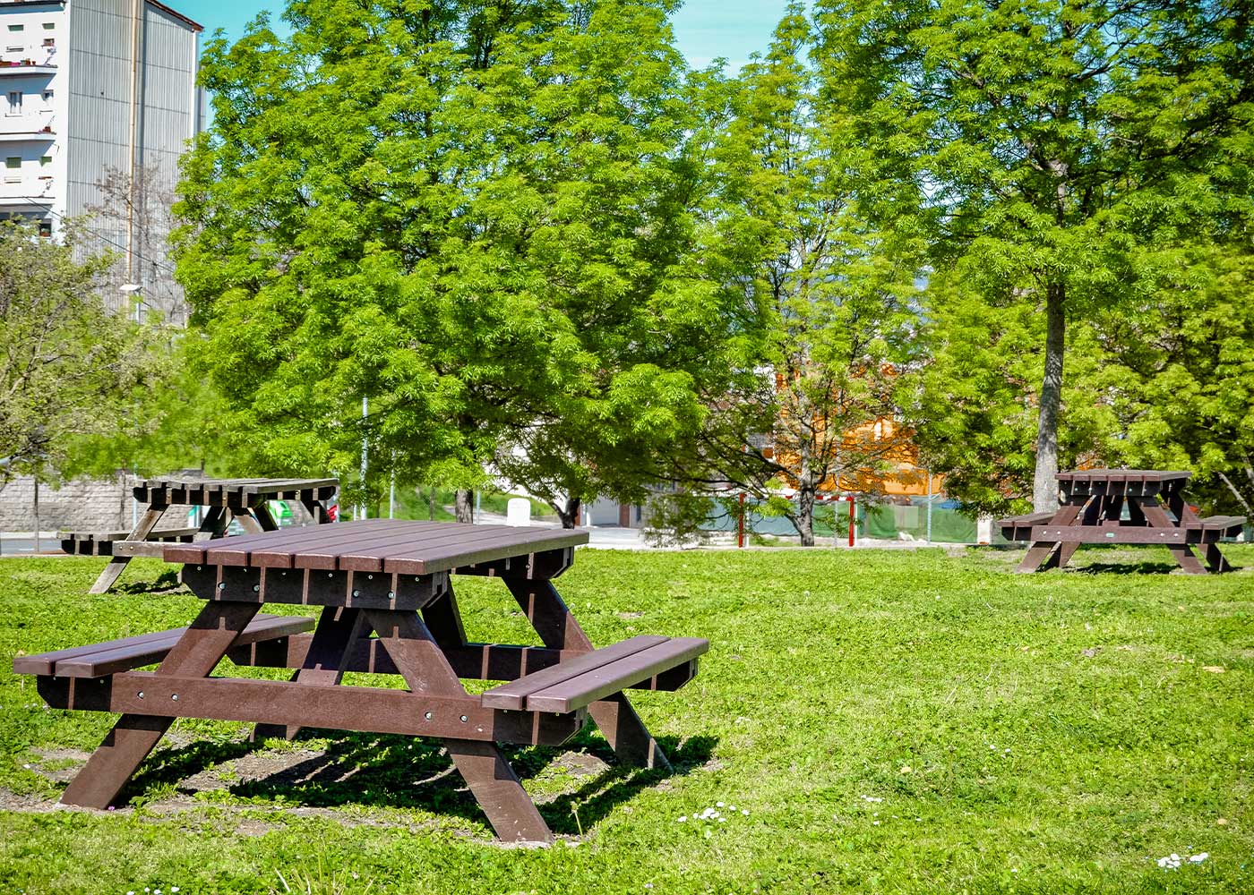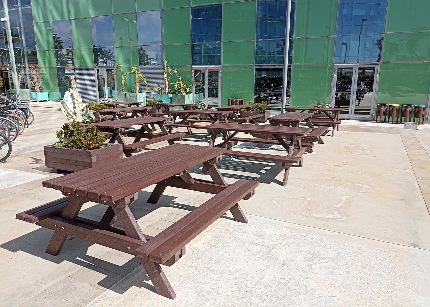 Instalación en Barcelona, cerca del puerto, con mesas de picnic, jardineras y papeleras GEA de material ReBnew, resistente a la corrosión costera.