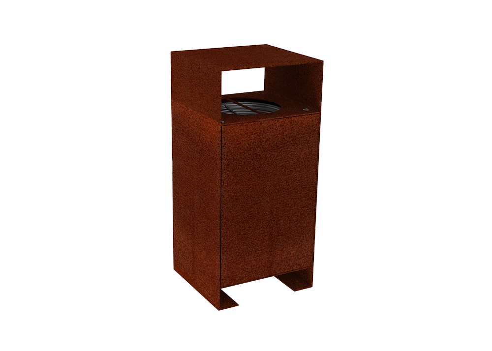 Papelera fabricada con estructura de acero corten de 6 mm, puerta frontal de acero corten. Cubo interior de acero galvanizado.