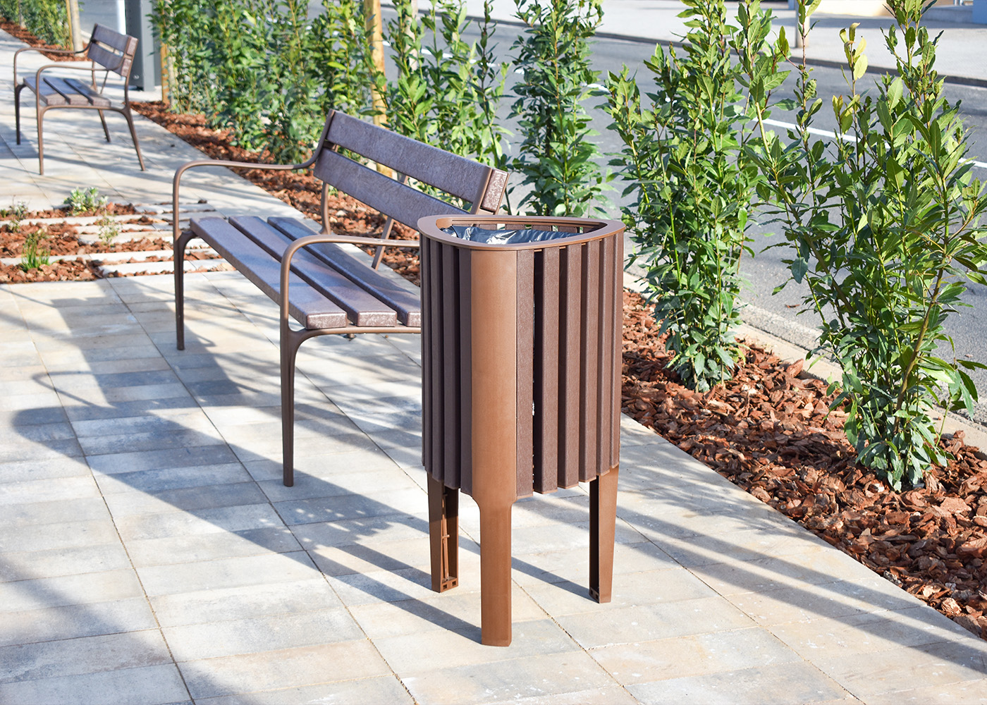 Papelera de diseño GEA en polímero reciclado, medidas totales (ancho x profundo x alto) 440x430x825 mm, compacta y adaptable con aro sujeta bolsas pensado para bolsas de 50 litros, fabricada en plástico ReBnew (el polímero reciclado de BENITO que está producido íntegramente a partir de envases del contenedor amarillo y no requiere ningún tipo de mantenimiento). Preparada para anclaje con tornillos según superficie y proyecto.
