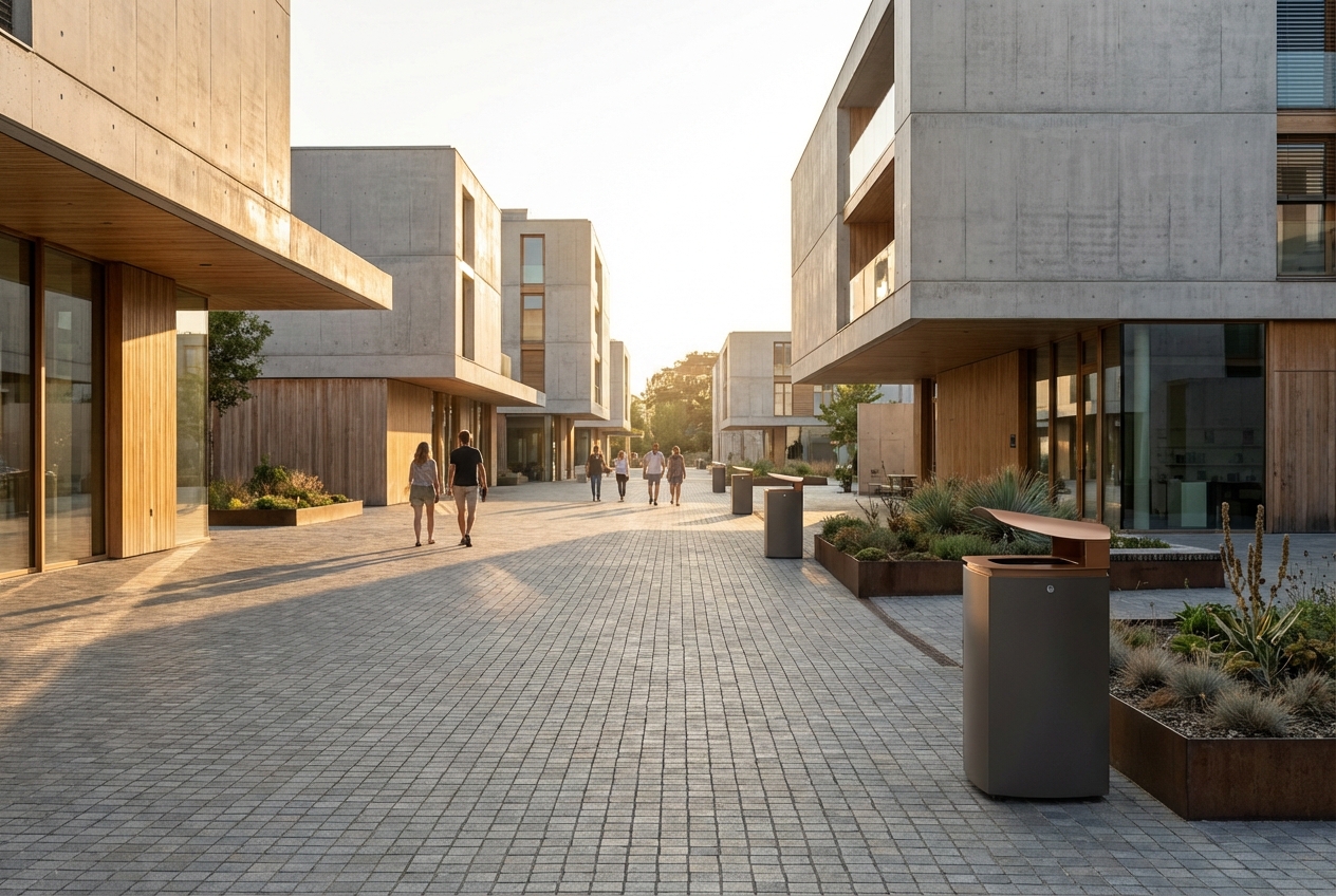 Papelera de diseño MIELEK M, medidas totales (ancho x profundo x alto) 410x410x920 mm, 80 litros, fabricada en acero (tratado con el proceso Ferrus el protector de triple capa para el hierro, que garantiza una óptima resistencia a la corrosión), cubeta interior galvanizada, cierre de seguridad autoblocante, tapa color marson. Preparada para anclaje con 4 pernos de expansión Ø10 según superficie y proyecto.