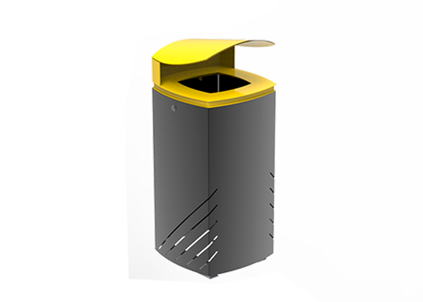 Papelera fabricada en acero con tratamiento Ferrus, proceso protector del hierro, que garantiza una óptima resistencia a la corrosión. El tratamiento Ferrus se compone de tres capas que se aplican después de limpiar toda la suciedad y las impurezas mediante granallado y consiste en un zincado, seguido de una capa de imprimación epoxi y un último recubrimiento de pintura poliéster en polvo color negro forja para la estructura, y tapa en color Amarillo RAL1021. Cubeta interior galvanizada.