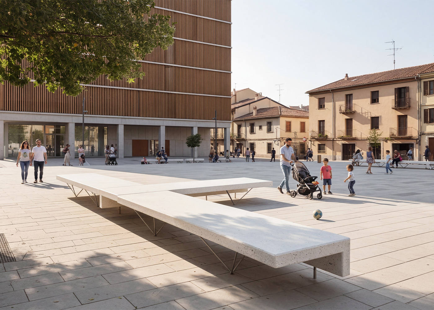 Banco de diseño ELA 3000, medidas totales (largo x alto x profundo) 3000x420x800 mm, fabricado con asiento de hormigón armado hidrófugo moldeado, color blanco granítico pulido, estructura de acero inoxidable mate. Apoyado sobre superficie preparada, por su propio peso.