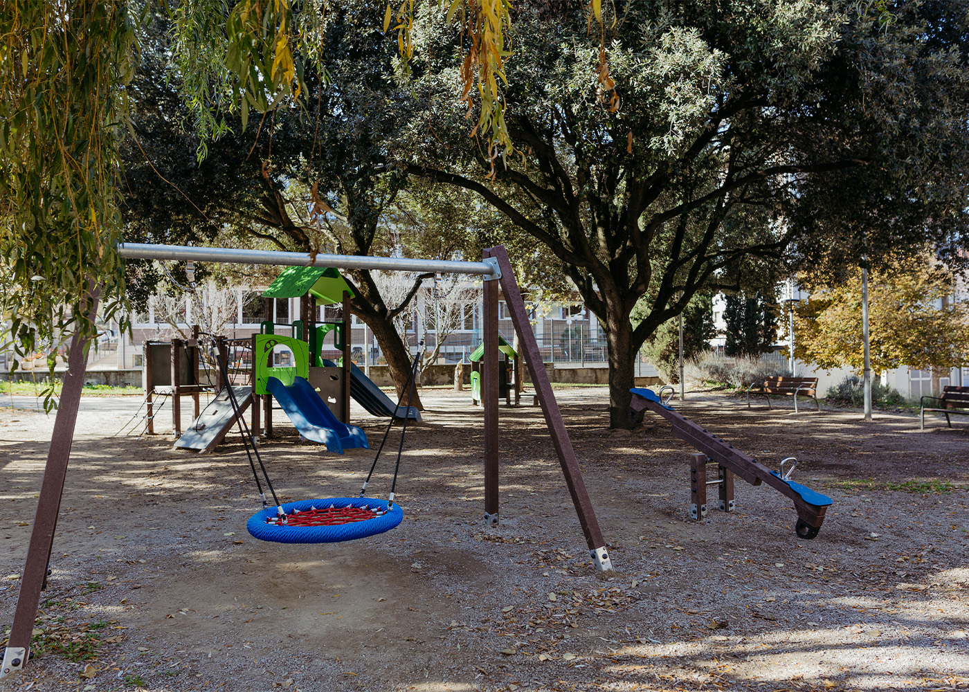 Columpio ReB Nido Ref. JREB00010: Estructura en plástico reciclado ReBnew y metal galvanizado, con cadenas de acero inoxidable. Dimensiones 2400x400x400 mm, pieza máx. 26 kg. Zona de impacto EN1176.