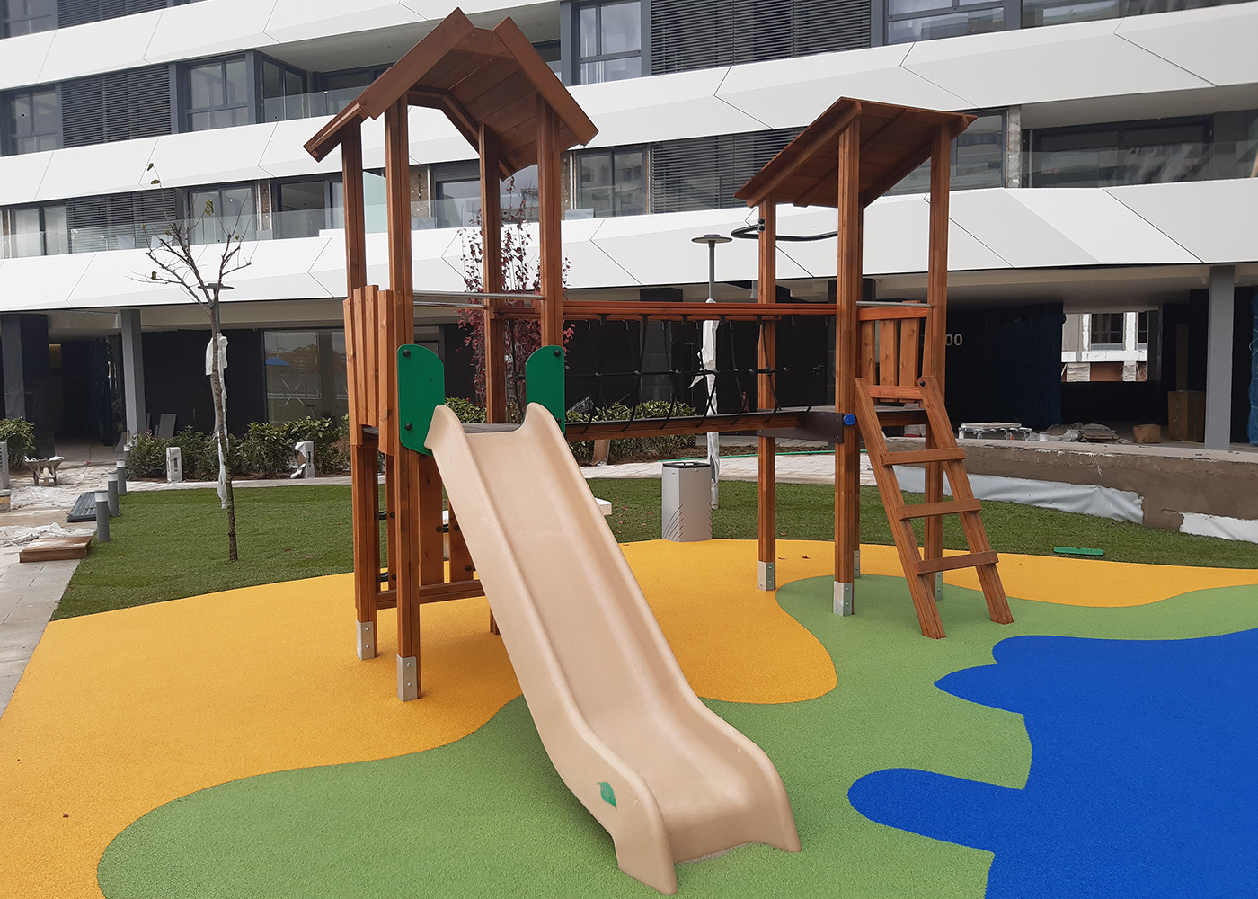 La colección LETO fabricada con materiales sostenibles: madera FSC, tobogán de cáscara de arroz y paneles ECOPlay. Estas estructuras se integran en todo tipo de entornos, des de los más rurales hasta los más urbanos.
