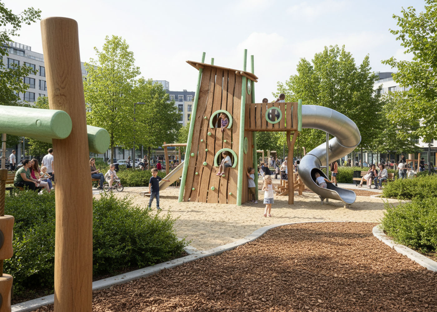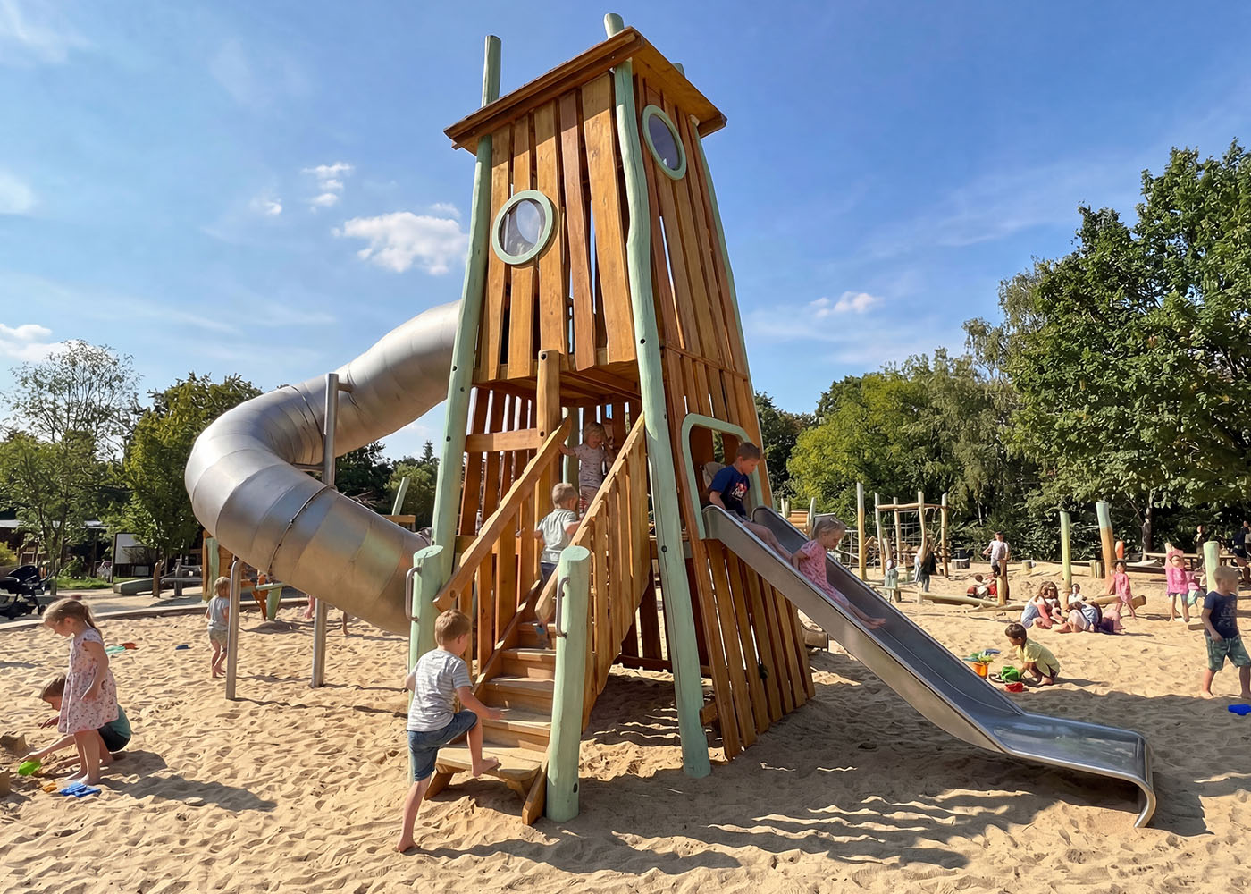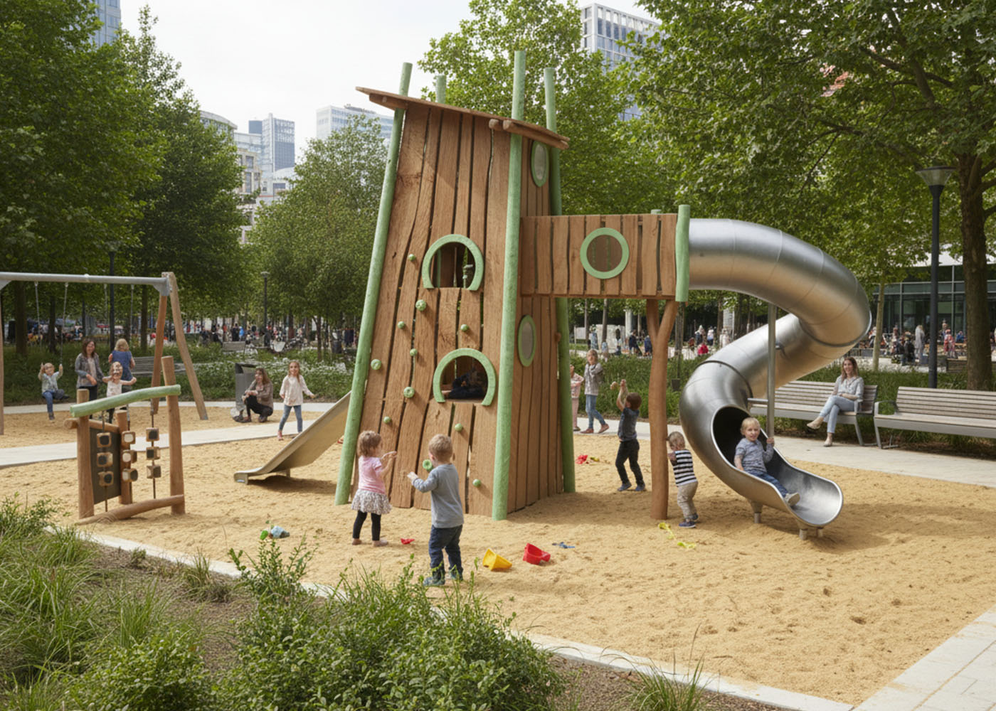 Elementos a cota 0 interactivos como el juego del “3 en raya”, una pizarra, grúa de arena etc.