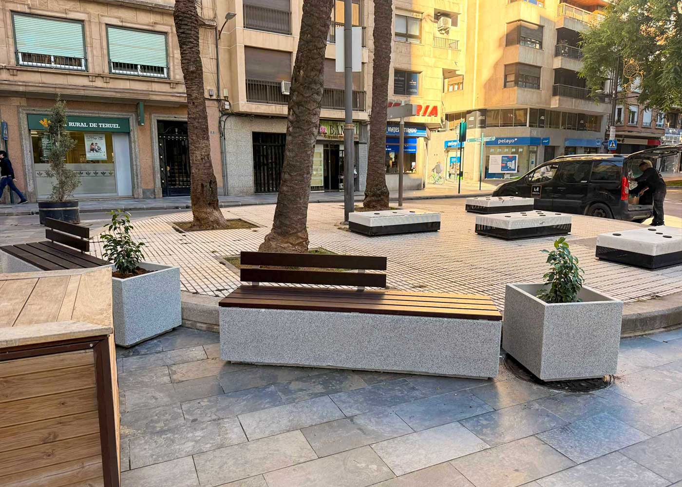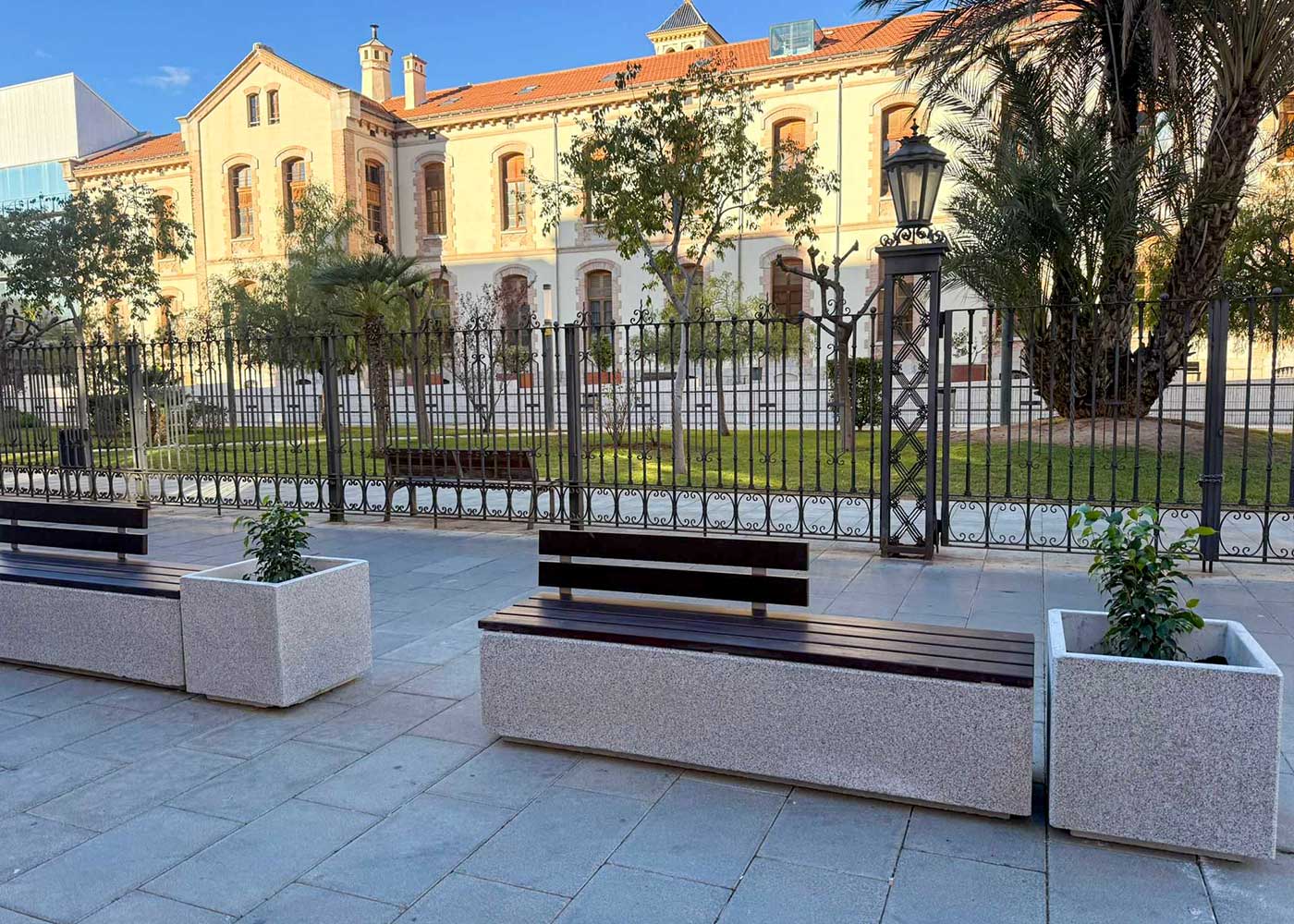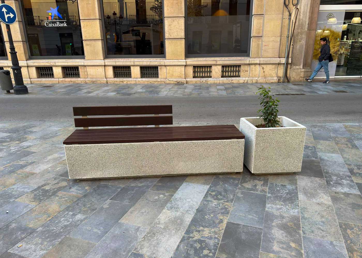 La intervención se completa con jardineras KUBE, integradas junto a los bancos para realzar la presencia del material y aportar valor paisajístico mediante la incorporación de vegetación. Esta combinación de mobiliario y elementos verdes contribuye a crear espacios más agradables, sostenibles y visualmente atractivos, reforzando la identidad urbana del centro de Castellón de la Plana.