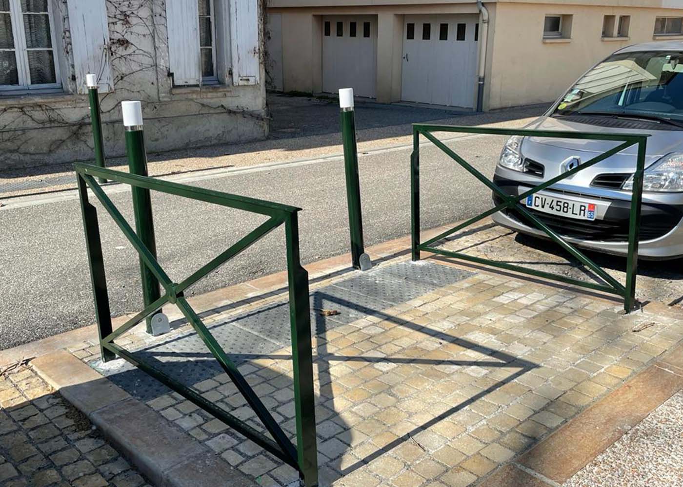 Bancos, luminarias y aparcabicicletas para mejorar un parque en Francia.