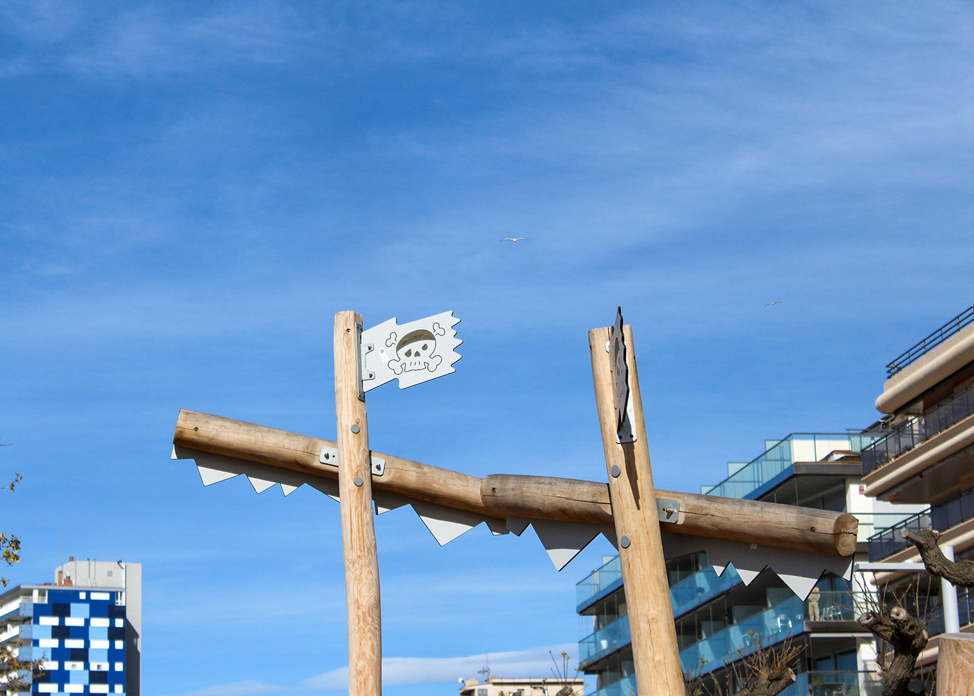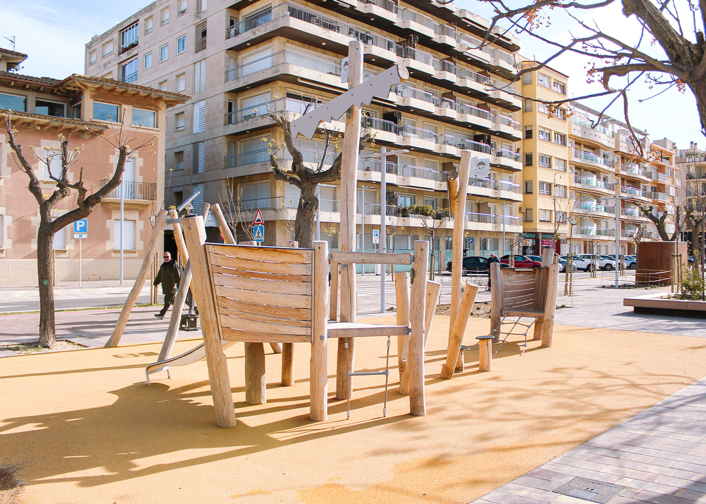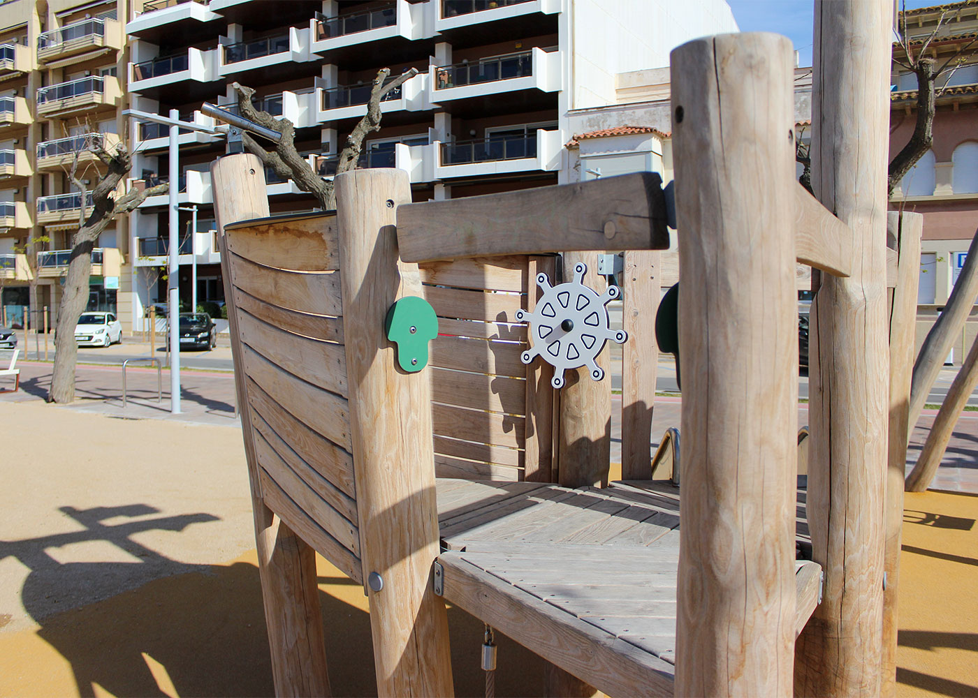 El espacio está compuesto por tres elementos principales: un columpio con asiento tipo cuna, un muelle y una estructura en forma de barco pirata que integra elementos de equilibrio, toboganes y red de escalada. Todo el conjunto está fabricado en madera de robinia, un material especialmente adecuado para exteriores por su alta resistencia y durabilidad.