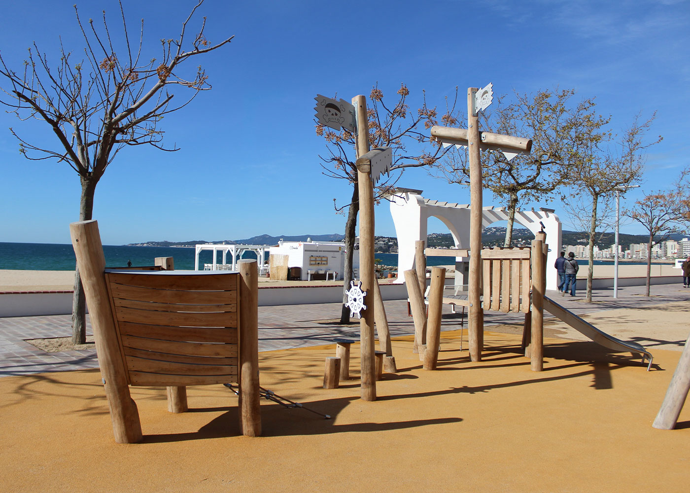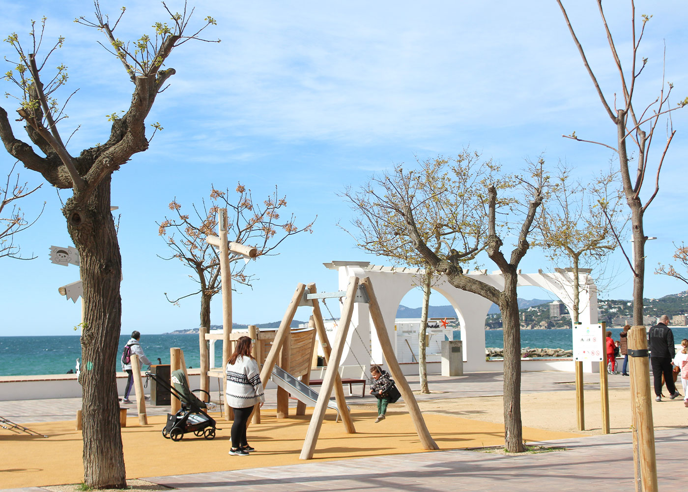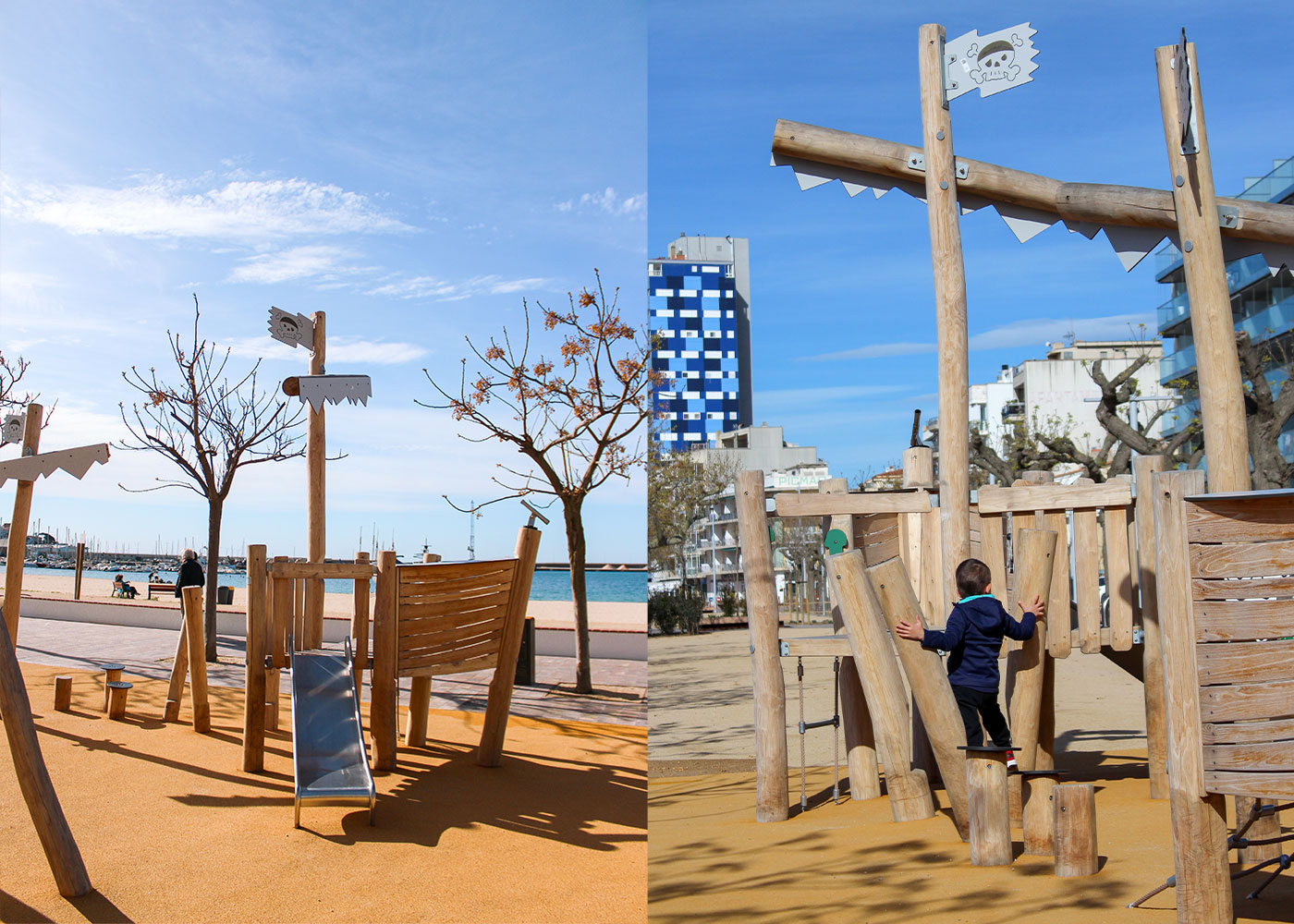 Renovación del parque infantil del Passeig del Mar de Palamós (Girona) con nuevos juegos de robinia, creando un espacio lúdico integrado, resistente y adaptado al entorno marítimo