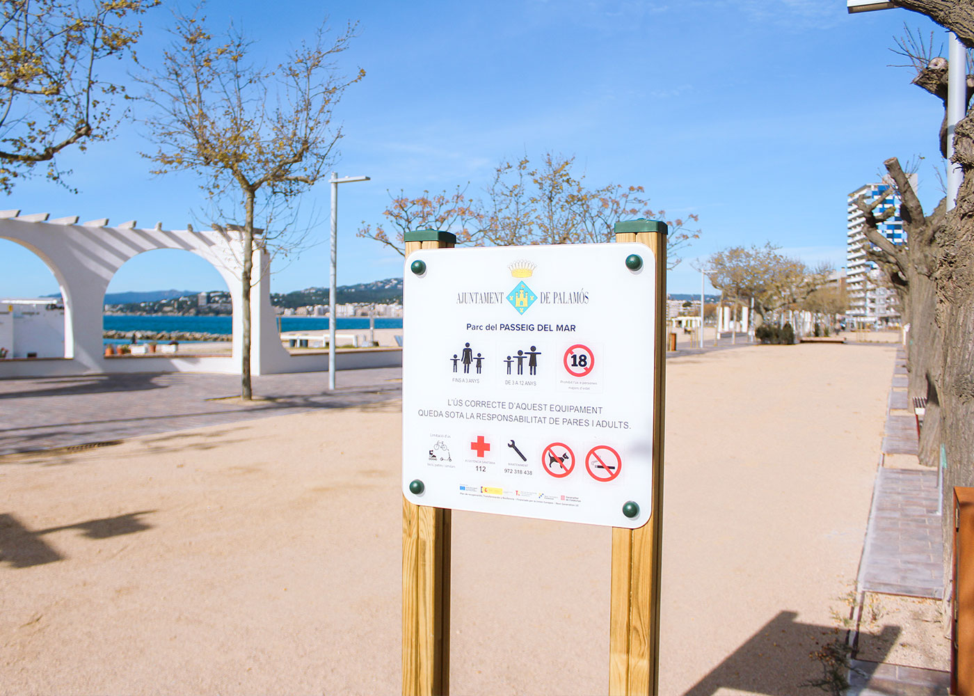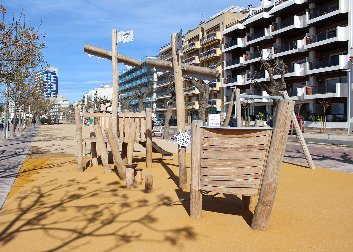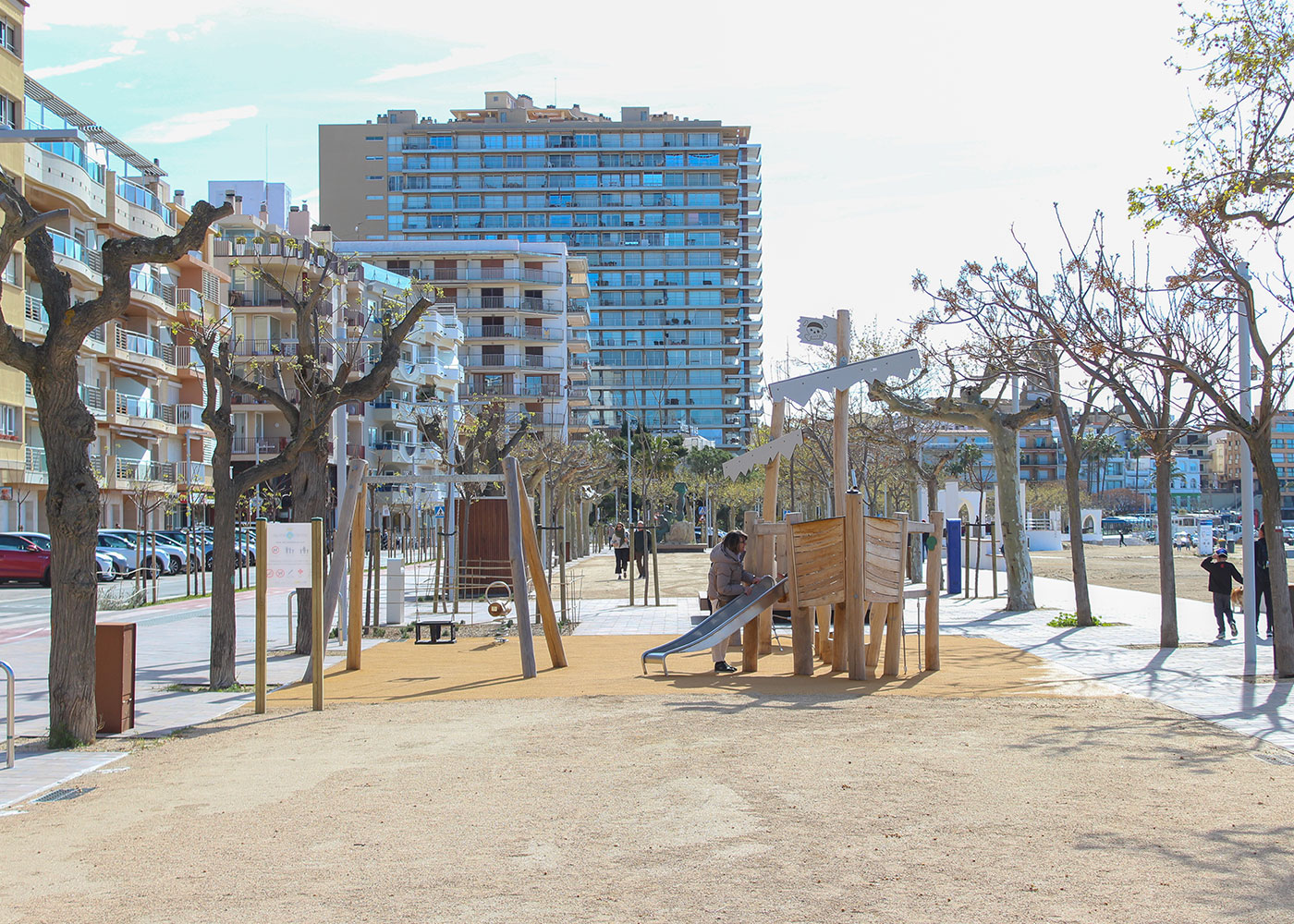 En el Passeig del Mar de Palamós se ha llevado a cabo la renovación del parque infantil, incorporando una nueva área de juego diseñada para integrarse en el entorno marítimo y responder a un uso intensivo.