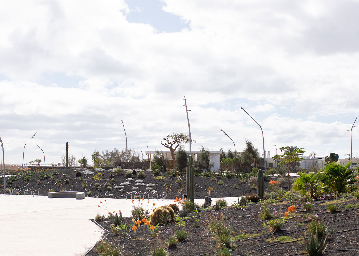Parque integralmente renovado en la localidad de Playa Honda, entre el aeropuerto y el pueblo, incorporando proyectores MILAN orientables y resistentes, y aparcabicicletas OMEGA para impulsar la movilidad sostenible.